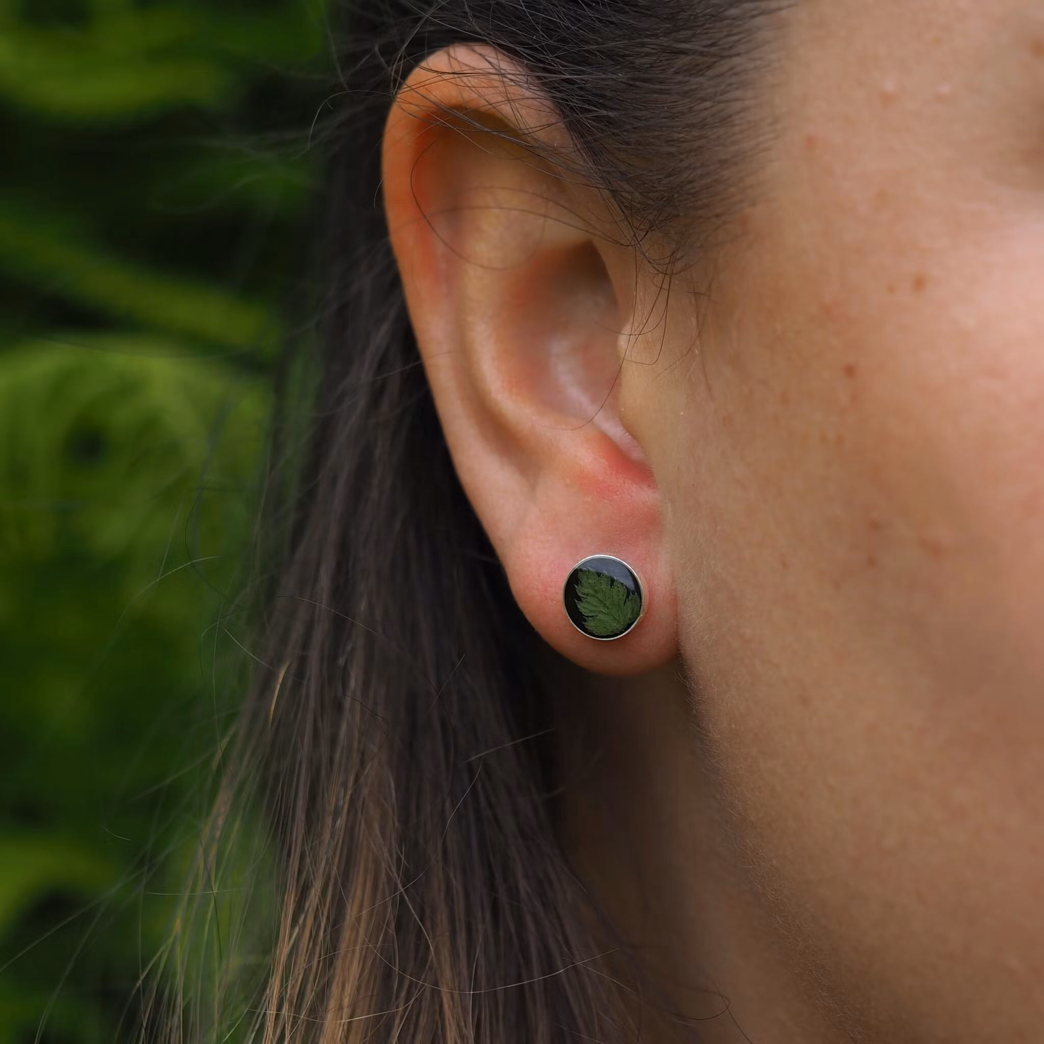 Disse fortryllende øredobbene fanger den ville, eldgamle skjønnheten i naturen. En ekte bregne, håndplukket lokalt, er innkapslet i klar resin og satt i en innfatning av sølv eller gullbelagt sølv. Bregnen symboliserer magi og mystikk, og knytter deg til naturens stille kraft.